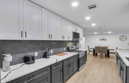 Discover your perfect getaway in this fully remodeled 4-bed, 3-bath home in Austin, TX, offering 2,700 sqft of modern luxury. With new engineered hardwood floors, a gourmet quartz kitchen, and custom tile work, this spacious retreat is ideal for corporate stays or family visits. Fully furnished, it includes high-speed Wi-Fi, flat-screen TVs, laundry facilities, and all essential dining amenities. Relax in the private backyard with an outdoor patio, perfect for unwinding. Located in a quiet, desirable neighborhood, you’re just 12 minutes from Downtown Austin with easy access to shopping, dining, and entertainment. Experience comfort and convenience in this elegant home.