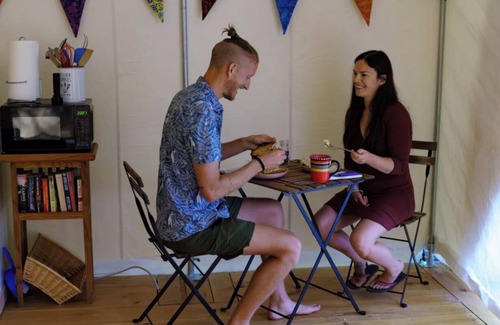 Experience restful relaxation in high style in our 16 x 24 outfitter tent. Complete with queen bed and pillow top mattress, kitchenette with mini fridge, Keurig, Hotpot and microwave, eating area with all dishware included, and living "room" with comfy seating around the in tent wood stove.
