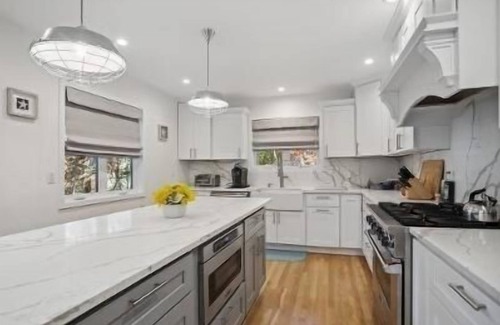 Luxurious Hamptons retreat. . Property is private and backs up to protected land. Home completely renovated. Fully stocked chefs kitchen. Viking Appliances, Quartz Countertops. Master suite has a King Bed, den/office an En suite marble spa bathroom double sink stand up shower spa jetted tub. Large double closets. Each of the other 3 bedrooms are pristine, bright and cheery. 2nd floor has a full size bathroom with tub.