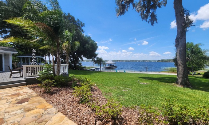 Beautiful 1.5 Acre property with luxury home on Little Lake Weir that connects to Big Lake Weir by way of a canal. New upgrades to the home in 2020: Brand new wood deck, fresh interior paint and outdoor furniture added. This quaint and homey lake house has a Kokomo style beach front and cottage house feel and includes use of 4 Kayaks. One of the larger sand beaches on Lake Weir with 167' of prime beautiful beach frontage, 3 bedrooms and 3 full baths. The Owner's suite has direct access to the private hot tub overlooking the lake. Private boat launch area is on premises where you can launch your boat or jet ski. The 140 ft. dock features a large covered activity area with a sofa bed swing, pub table & chairs and a refrigerator for your drinks (The BEST seat in the house!). The Chef's Kitchen is very large and luxurious "Tuscan style", with warm smoky tones. There's plenty of space for a large family and lots of cooking. The kitchen and living room each have glass double French doors that open up to the wooden deck and flagstone patio, spanning the entire back of the house. There's a charcoal grill & a Weber gas grill on the patio. There are multiple outdoor table settings for lounging and watching the sunsets. Volleyball, bean bag toss,& ping pong are on site for your outdoor activities. The glassy lake is great for your skiing and wake-boarding enthusiasts. Check out the photo of the 8 lb. Large Mouth Bass caught from our dock! Enjoy a relaxing and peaceful vacation on Little Lake Weir and for a change of scenery; a short 1/2 mile boat ride through the canal to Big Lake Weir or 5 minutes by car to visit County parks / beaches, Gator Joe's restaurant, Eaton's Beach Sand Bar and Grill. This is also a great lake to bring your sailboat!