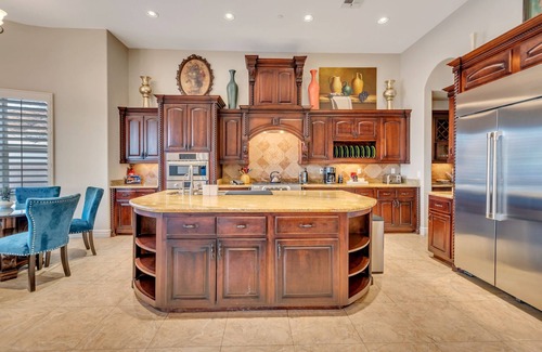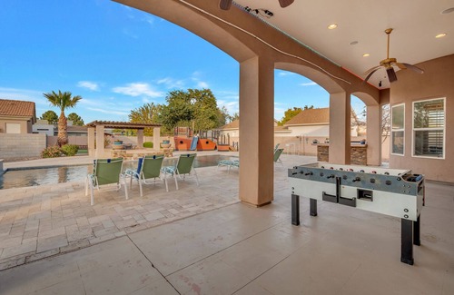 Our home offers the luxury of a large heated pool/spa with jacuzzies, as well as a huge backyard with a Pirate Ship Playhouse. The huge covered patio area is also great for hosting large groups with a big dinning area, complete with a outdoor propane BBQ. Enjoy watching your kids play & having fun on the boat and swing set area or play our life-sized games like Chess or Bean bag toss. Are you a golfer? There's a mini putting green! The huge home boasts an open floorplan with enough TV's for everyone's viewing. Crystal chandeliers adorn the vaulted ceilings, and fans are in all the bedrooms. The master bedroom suite has a remote-controlled, dual-opening fireplace to the jetted garden tub and the master bedroom. The home is lavishly decorated and stocked with all the amenities for dining, entertaining, and leisure. Our home is close to the 202 giving you access to the events and sports in Scottsdale, Tempe & Phoenix. Won't you come and stay with us?