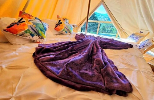 Nestled in the gorgeous Shenandoah Valley, minutes from the National Park and Skyline Drive, lies this unique glamping experience. Enjoy a totally private escape into nature on a traditional organic family-owned farm in your luxuriously furnished tent, with a lush queen bed, adjacent rustic bathroom facilities, and a large deck overlooking an exquisite mountain view. Cook over an open fire pit and enjoy colorful sunsets with your loved one. Upgrade your stay with a special luxury package!