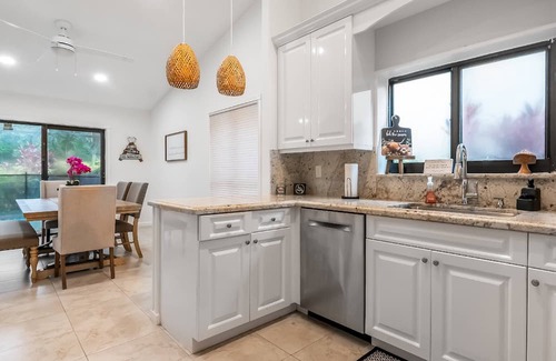 Indulge in the Florida lifestyle with our beautifully appointed home. The sleek, modern kitchen boasts marble countertops, state-of-the-art stainless steel appliances, and ample space for culinary creations. Entertain guests or enjoy family meals in the bright, airy dining area.