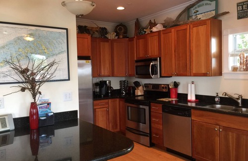 * Kitchen stocked with a blender, spices and staples