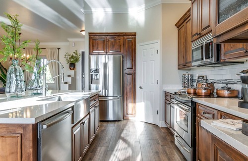 Check-in smoothly with a Nest smart lock and immediately see the beautiful views beyond the billiards table in the great room right next to the kitchen. Gather for a family meal at the dining table in this area. Sip some wine while having a chat in the elegant, bohemian chairs in the nook area next to the kitchen. We know how everyone tends to gather in the kitchen, so there is plenty of space and seating to enjoy each other in this big open area of the kitchen, nook, great room, and dining room.