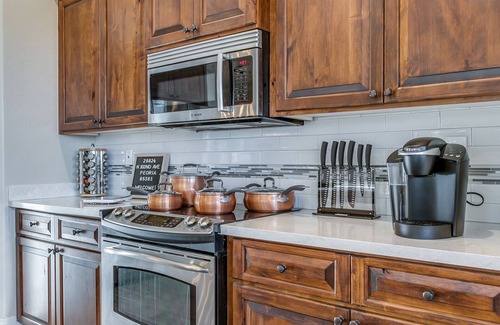 Cook up a delicious meal with copper cookware on a high-end electric range. A full spice rack will complement your dishes and a high-quality knife set will make prep easy. We’ve got you covered with cooking oils, cooking utensils, and small appliances, like a blender, food processor, mixer, and toaster. Look for little surprises in the pantry! There are plenty of dishes and glasses for indoor and outdoor dining, along with copper mugs and saguaro margarita glasses! A Keurig is provided with an assortment of K-cups, creamers, and sweeteners.