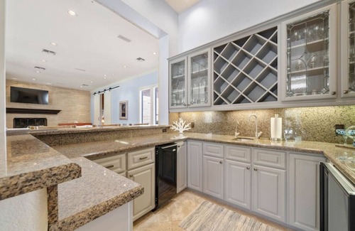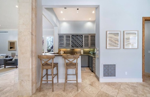 You’ll know you’ve arrived in paradise when you hit the palm lined driveway of Las Palomas. The entry foyer leads to the massive living room with multiple seating areas, a bar and billiards room. The back wall is lined with windows facing the beautiful private pool and patio, filling the space with natural light. The study off the living room features beautiful floor to ceiling wood accent walls and has a premium leather queen sleeper sofa facing a large TV. There’s also a half bath next to the bar. A large dining room with a gorgeous chandelier and table lead to the kitchen.