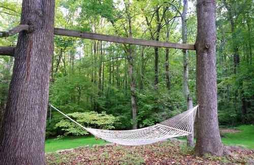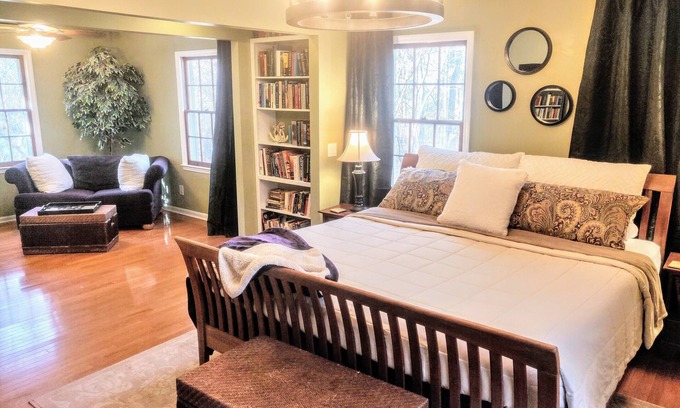 Peace and quiet. Beauty and function. Stretch out and enjoy this 1900 square foot luxury 'apartment' - - the whole main level of this beautiful Milton home. Your separate entrance opens into your spacious open concept living room/kitchen which separates a king executive suite from two bedrooms and bath, all tastefully decorated in a comfortable, eclectic mix of antique and modern furnishings. Hardwoods floors, granite counter tops, copper sinks, clawfoot tub, jacuzzi, walk-in shower, huge cherry top island, fireplace, treadmill, beautiful decor, screened porch, hammock, and rocking chair veranda - all nestled in the woods!