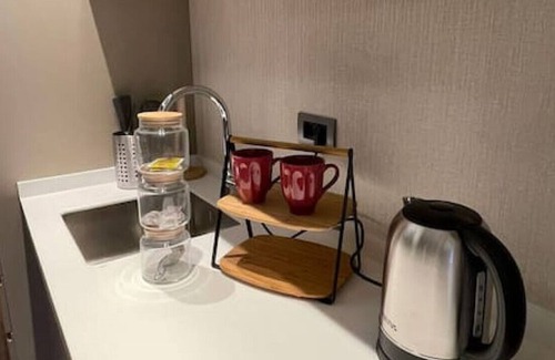 The apartment features 5-star amenities including: AC, WIFI, a dishwasher, an electric kettle, a microwave, a coffee corner, a water dispenser, a Smart TV, and ceiling-high windows.