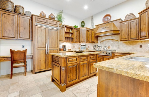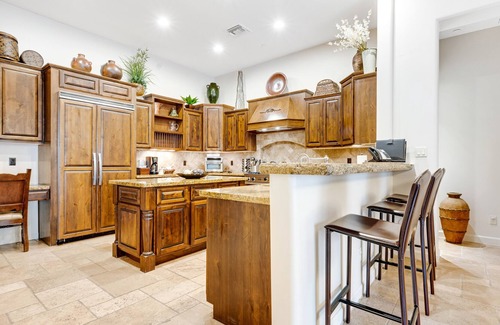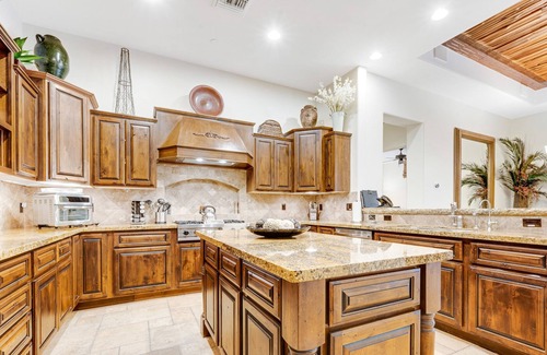 Right at home, your enclosed backyard features a private plunge pool, several comfortable seating areas, and a wood-burning firepit for evenings under the desert stars. You'll find luxurious Southwestern-style furnishings, high, wood-beamed ceilings, abundant natural light, and two gas fireplaces inside. Don your chef's hat and step into the gourmet kitchen to whip up mealtime masterpieces, then serve up your culinary creations at the large breakfast bar or adjacent dining table. If the weather is nice - and it probably is - step out the French doors and dine alfresco.