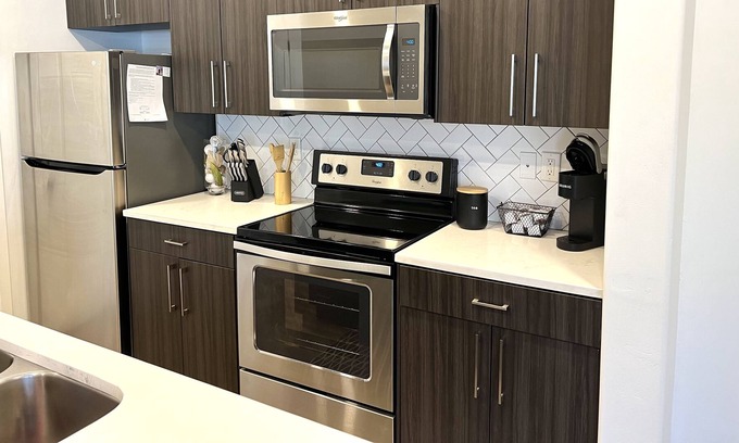 The foundation of the space is luxury, modern, and open concept living. When you walk in through the front door, you're welcomed with a chef's kitchen to your right, a cozy living room furnished with a large sectional straight ahead, and the bedroom + restroom to your left!