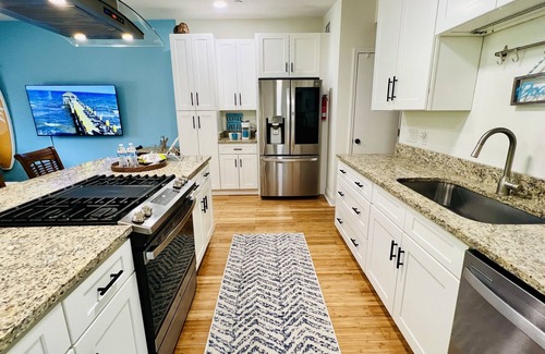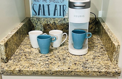 The gourmet kitchen is one of a kind with high-end stainless-steel appliances, gas stove, and hooded vent fan. Coffee bar and a single cup Keurig and tea. Wine glasses and beer glasses available.