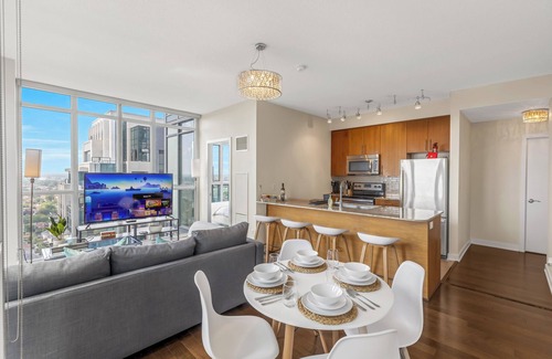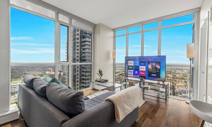 Experience luxury in the heart of Mississauga! Enjoy our stylish, 2BR+den condo with breathtaking city views. Steps from shopping, dining, transit. Features ENDY mattresses, Smart TVs, high-speed internet, fully-equipped kitchen, private balcony, and secure parking. Sleeps 7 comfortably. Perfect for groups, families, or business travelers. Your comfort, convenience, and style await!