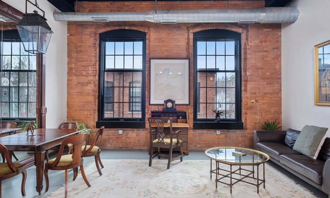 Luxury two-bedroom loft apartment for in the prestigious Cable Mills building in Williamstown, Massachusetts. A five-minute walk to all the great Williamstown restaurants and coffee shops. 16 foot ceilings throughout. Filled with light and antiques. Roche Bobois leather sofa, rare Baker octagon coffee table, and heirloom Chinese rug in the spacious living / dining room. Fully equipped modern kitchen with stainless steel appliances. Two spacious and bright bedrooms with large closets, one walk in. Brand new steam shower for cold winter and spring days. Ample closet space. 1100 square feet.