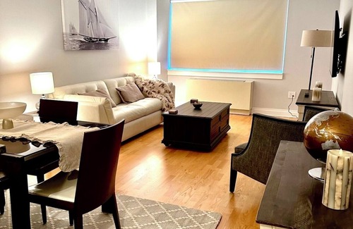 Enjoy a stylish experience at this centrally-located place. In the heart of the UES, I am offering my newly renovated 2 bedroom, 2 bath condo where you will experience every luxury such as a pool, dry, and wet sauna, library, fully equipped gym with Peloton bikes, and even a playroom.