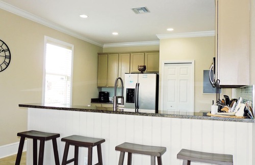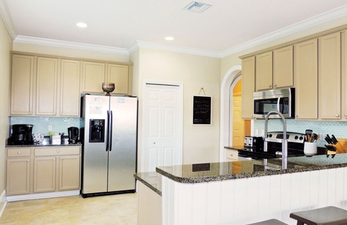 The home itself features a great room, newly furnished with comfortable and stylish leather sofas and an entertainment center equipped with a large flat screen Hi Def television, DVD player and over 50 cable channels. There is also an alternate living area, within the great room, with a pull out sofa and an oversized chair, providing a great view of the pool and the lake. The dining area has a casual pub style bar table with 8 tall chairs along with breakfast bar & 4 additional stools. The open concept floor plan features an expansive bank of sliding doors giving access to the pool area and great views beyond.