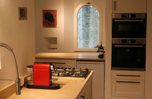 • L-shaped kitchen with gas hob, integrated double ovens (including combi/microwave), dishwasher, fridge, two sinks, Nespresso coffee machine. Plenty of glasses, crockery and utensils.