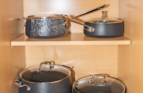 -A FULLY equipped kitchen with brand-new stainless steel appliances, including professional-grade pots & pans.