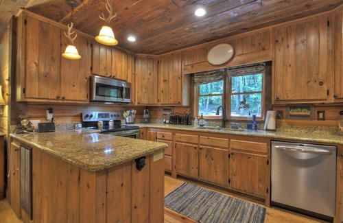 The cabin features a comfortable living room, a spacious loft, and a fully finished basement, each equipped with TVs. The kitchen is fully stocked with all the essentials you'll need to prepare your favorite meals.