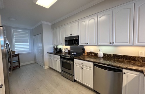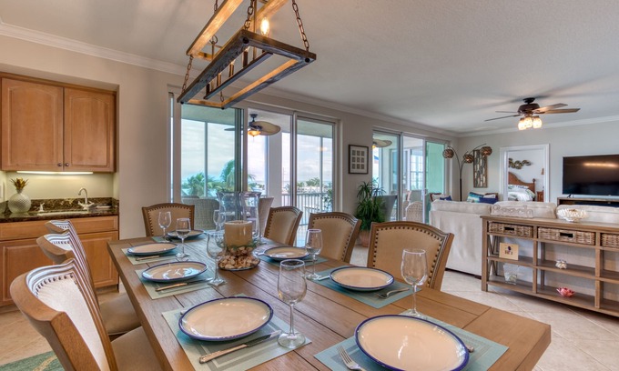 The screened balcony has plenty of seating and breath-taking views of both the ocean and inside bay on the quiets side of the marina. The balcony includes comfortable cushioned seating for relaxing and a dining table to enjoy a meal. The master bedroom has all new furniture (not pictured), king bed with a water view, plantation shutters, and access to the balcony. The second and third bedrooms also both have king beds, and plantation shutters. The living room and all bedrooms are equipped with brand new HD Smart TVs with access to Cable, Apple TV, Netflix, Amazon Prime Video and more. The gourmet kitchen has granite countertops, stainless steel appliances, a Nespresso expresso maker and is loaded with all of the cookware and utensils you need to feel right at home. The 3BR unit has an open floor plan (much larger than the 2BR), new flooring, and the dining room has comfortable seating all guests. The wet bar is loaded and even includes a margarita making ice blender. The condo has a full washer and dryer and all linens are new. There is also an additional freezer for bait and ice located in the kitchen.