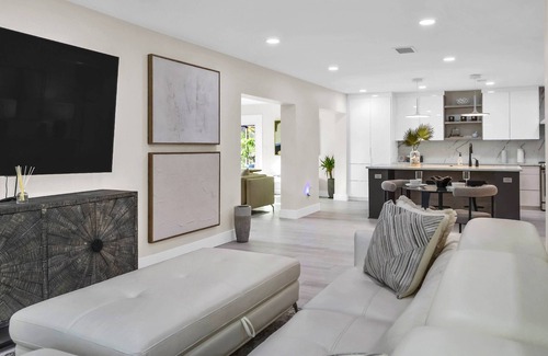 Step into a bright, open-concept living space where natural light pours in, highlighting designer finishes and all the modern luxuries you expect in a high-end home. The welcoming living room features a cozy seating area and 75" smart TV, perfect for relaxing after a long day.