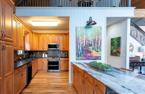 Inside, the home welcomes you with vaulted wood ceilings, a fully stocked chef’s kitchen, and a seamless flow between kitchen, dining, and living spaces—perfect for hosting, relaxing, or reconnecting.