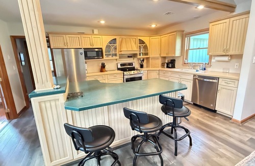 Experience lakefront vacationing and enjoy breathtaking lake views from almost every room with walls of windows and an open contemporary design. Great Room has floor to ceiling stone fireplace with sliders to deck and flat screen TV. Separate Florida room features dramatic window wall and hardwood floors. Master bedroom on the main floor is complete with garden tub and separate shower. On the lake level, relax in the second family room with 50 inch flat screen and screened porch or step out to your own private sandy beach and dock. Central AC for those hot summer weeks throughout the house. We finished our first floor renovation with new flooring and kitchen appliances.