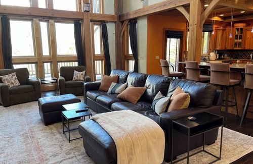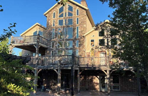 This private home is conveniently located near several ski resorts, including Wasatch Peaks Ranch, Snowbasin, and Powder Mountain, and is a short distance from Park City (38 mi). Perched on 3+ acres with majestic views of Thurston Peak and Snowbasin, this beautifully landscaped property with ample deck space offers a tranquil retreat for guests. The main floor hosts a large well-equipped kitchen, dining room, comfortable living room with oversized leather sectional and fireplace, and 2 half baths. The master bedroom with king bed is also on the main floor, and boasts high ceilings and a large en suite bathroom with a double shower and separate jetted tub. Outside the main level is an expansive deck with several living/dining seating areas and gas grill. The upstairs floor has 3 guest bedrooms, each with a queen bed, and an open office space with a queen futon, 2 full bathrooms (shared among the 3 bedrooms and office), and outside deck space. The lower level contains 2 guest bedrooms, one with an XL full bed and ensuite bathroom, and one with a queen bed. It also has a theater room with 9 reclining theater seats, bar and gaming area, and full bath. The lower level walk-out patio is equipped with a hot tub, overhead heaters, and propane grill. House amenities include Starlink WiFi, smart TVs in all bedrooms and common areas, XL washer/dryer, garage space for a large SUV, mud room, under-counter wine refrigerator, and radiant floor heating on main and lower levels.