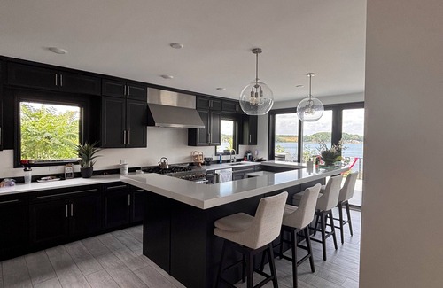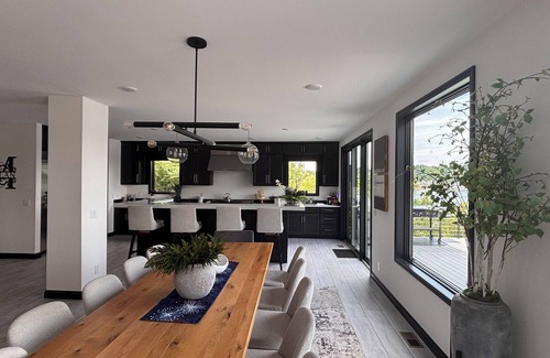 Step into our beautifully furnished main floor and take in stunning lake views from the moment you arrive. The open-concept living area features a cozy seating space, fireplace, and large TV—perfect for relaxing together. Gather around the modern wood dining table that seats 12, or cook up a feast in the chef’s kitchen with high-end appliances and a two-tier island. Just down the hall, you’ll find a walk-in pantry, a half bath with urinal, a full laundry room, and a convenient wet bar with an ice maker and coffee bar.