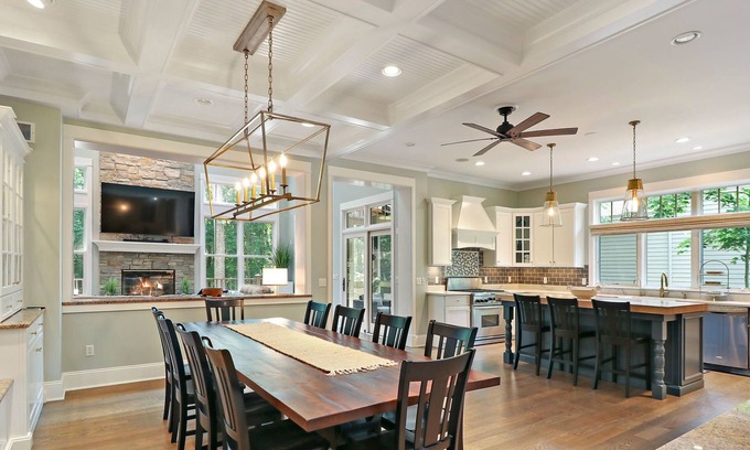 Step into a newly renovated space, featuring a brand new kitchen and a two-story family room. The backyard boasts a serene view of a deep wooded lot- it is very common to see a family of deer passing through! Stay cozy with three fireplaces and indulge in relaxation with a soaking tub in the first-floor master bedroom. Gather around the large fire pit for nighttime s'mores. Drive the golf cart to the beach, lake, or clubhouse for added convenience.