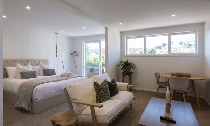 Experience the best of Auckland at your doorstep! Immerse yourself in a newly renovated, sun-soaked, and exclusive studio apartment with a perfect blend of tropical coastal and Scandinavian design. Nestled in the heart of Auckland's iconic beach village, this luxurious haven boasts an array of lavish amenities, including a private balcony, off-street parking, coffee machine, plush king size bed, chic workspace, fully equipped kitchen, opulent bathroom, and in-house laundry facilities. You can wander down to the beach – take in the magnificent views while exercising on the promenade walk that stretches over 10 km from Auckland’s CBD to St Heliers. Pop down to New World at East Ridge Shopping Centre, only 1km away and open for online orders. Or purchase your daily needs from the convenience store across the road.