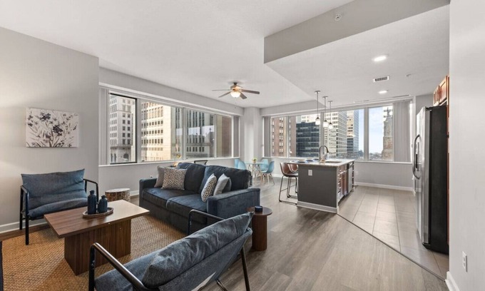 Unwind in this luxury two bedroom apartment in Downtown Cleveland, an area with historic and cultural charm. Downtown Cleveland is full of award-winning restaurants, bars, shops, art galleries, and attractions. Adventure through all that Cleveland has to offer with this centrally located apartment. Once you are ready to relax, retreat to this comfy home!