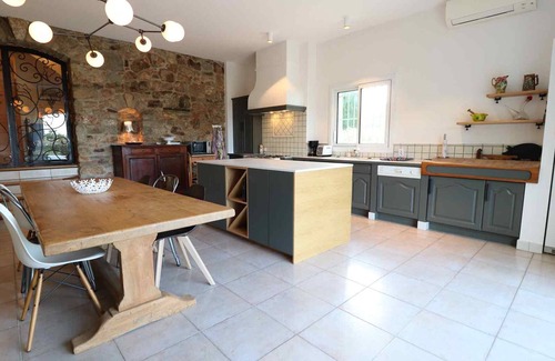 On the heights of Argelès-sur-Mer, 5 minutes from the Racou and Collioure beaches, this magnificent 160m² apartment in an authentic Catalan farmhouse offers every comfort and tastefully decorated. It sleeps 4: