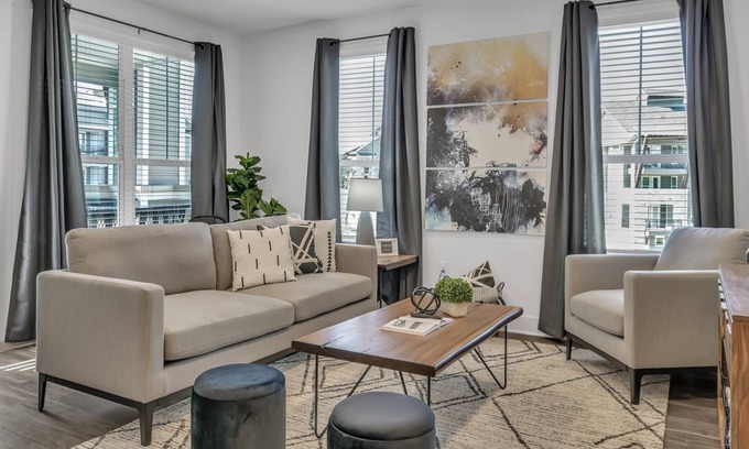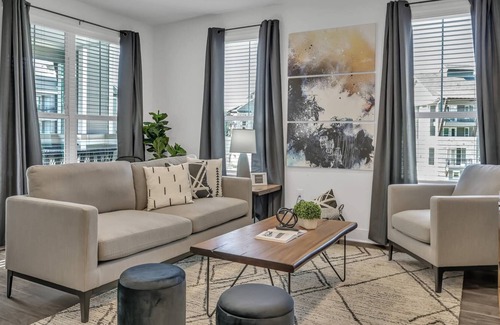 This third-floor apartment is fully equipped with luxury accommodations and amenities for work and relaxation. In the unit there are 2 bedrooms one with a king bed and one with a queen bed, high-speed WiFi, a raised balcony for more privacy, a Bluetooth speaker, access to a covered parking spot, and much more to make your stay comfortable. The resort-style community amenities include a pool, expansive fitness center, a spacious cabana with an outdoor bar and fireplace, grilling stations, and a bistro lounge. On the fourth floor of each building, there is access to a co-working space to take a call, have a meeting, or for a change of scenery for your workday. This is the perfect spot if you are in town for an extended work trip, or simply want to enjoy the luxury accommodations!