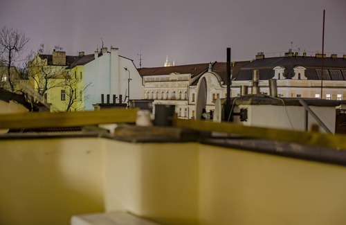 Beatiful artistic spacy loft with terrace .Combination of art, antiques and very modern design creates very comfortable atmosphere. Open kitchen is connected with the big living area, includes dining, relax, TV corner, working space with entrance to the terrace 22m2 with a view to the roofs of Old Town, Petrin Hill and more. Two bedrooms with separate private bathrooms. The apartment is equiped with all you need to feel comfortable and like home.