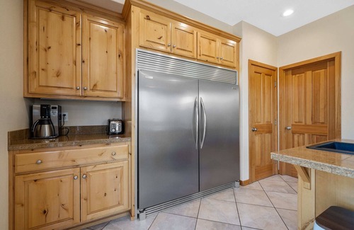 The deluxe kitchen features an industrial fridge for ample storage space. The kitchen has dark granite tile counter tops with lots of counter space. The island has seating space for 4. The dining room has an over-sized table with seating for 8.