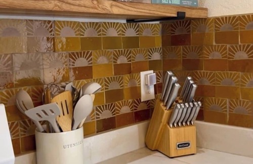 Pool/Backyard: Check out our amazing new heated saltwater pool with a sun shelf! It's a shallow pool with a maximum depth of 4.5 feet, perfect for relaxing and cooling off. The pool is in our large backyard, shared with our sister cottage, Coco, so it's a great spot to meet new friends while on vacation. We've set up a table with four chairs and provided pool floats, sun loungers, and umbrellas. There is also a BEAUTIFUL mural where you can snap some memorable pics in front of. 📸