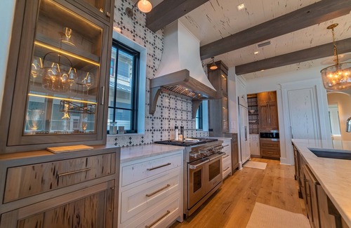 *The gourmet kitchen makes a statement with high-end appliance brands such as Subzero, Wolf, Fisher and Paykel. The 6-burner gas range with griddle top is ready for your most discerning chef. The oversized refrigerator/freezer, two dishwashers, pantry space and many accessories make cooking and clean up a joy. The beautifully illuminated quartzite island seats five and the dining table invites all ten guests to dine together. (BTW – if shopping, cooking and dishes are not your thing, ask us about our concierge services and let us do the rest!)