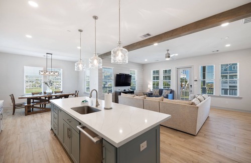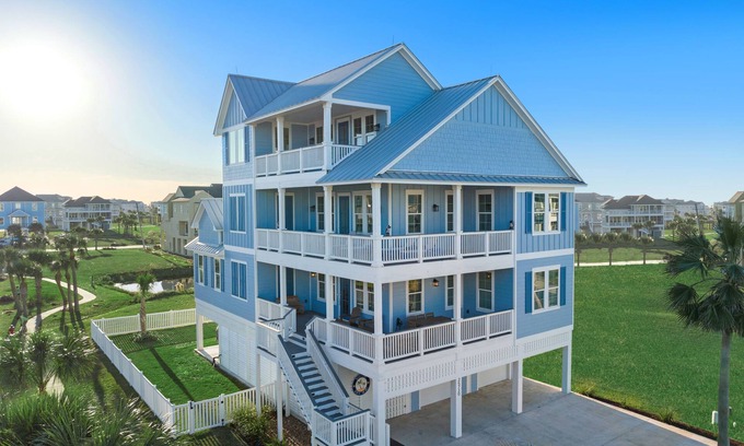 This five-bedroom Galveston vacation home accommodates up to 16 guests (maximum 10 adults) with ease, offering an expansive, open-concept living space designed for relaxation and entertainment. An in-home elevator provides seamless convenience for transporting luggage and groceries.