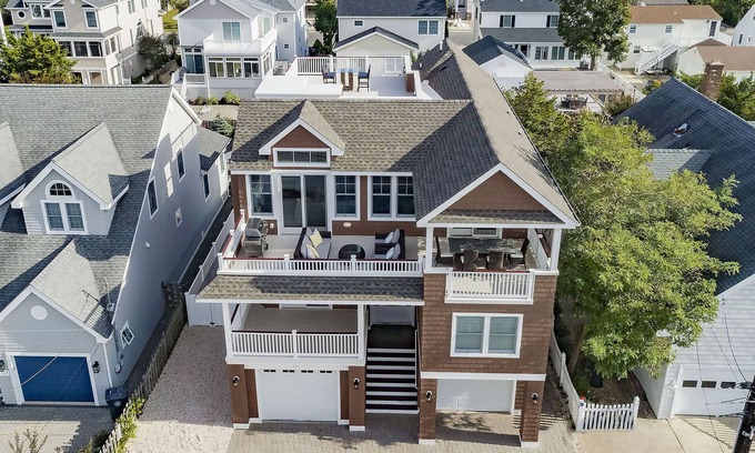 Luxury accommodations await you in this like new beautifully decorated 3000 square foot reverse living LEHYC home. The home was built the summer of 2019 and sleeps 12 in the five bedrooms, including three suites! The master suite is on the third floor and has a king bed and an outdoor shower right off the adjoining full bathroom....you don't see that everyday! On the second floor, there are two Jr. Suites each with a queen size bed/ adjoining bathroom, and two additional bedrooms each with two twin beds and another pullout twin bed in each (sleeps 3 in each room). The home is situated on an oversized lot with a 14 X 30 ft HEATED pool, an elevator to all three levels, beautiful custom woodwork and hardwood flooring throughout. Enjoy the 12' ceilings in the great room and kitchen on the third floor right off the expansive balcony housing high end outdoor furniture including a covered outdoor dining table. Additionally, there is a family room on the middle floor with a second beverage fridge and a covered balcony. Amenities include quartz countertops throughout, a gourmet kitchen with 6 burner WOLF range/oven and wine fridge, 3 flat screen TV's, internet access, video game console, second outdoor shower on the ground level, outdoor gas grill, beach passes, two zone central air, and a gas fireplace. We just added a six person dining table near the pool deck (not pictured). We take very good care of our home to make sure it is neat and tidy for all guests. Newly washed bed blankets are provided for each guest.