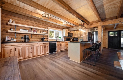 .As you approach the cabin from below, following an old park road through the woods, you'll be greeted by an excellent seating space on the front deck under a huge roof during rainy days or hot summer. This is a great spot to get acquainted with the property before entering the cabin, where you'll find a charming open-concept living room, all new Amish made wood furniture, a well-appointed kitchen, and a cozy spacious dining room. The kitchen features stainless steel appliances and granite counter-tops. The fully stocked kitchen has everything needed to prepare and enjoy a dinner "at home" . You can grill out on the gas grill out on the rear deck or use the full-size range to whip up a delicious meal. The back porch provides outdoor eating space and is a nice quiet nook to relax and enjoy the sounds and sights of the forest while enjoying evening dinner under sky's. When the sun sets, head back to front or rear deck and enjoy the night with your group.