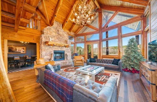 Head up the dramatic curved log staircase from the main level and you will discover 3 more bedrooms and another bunk room. One wing has 3 private bedrooms with beautiful views from every room.