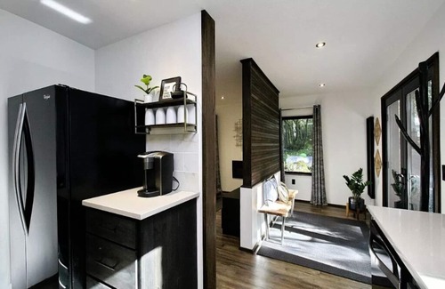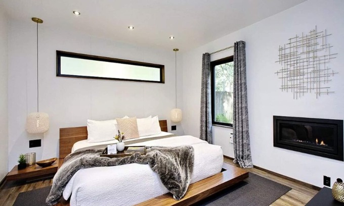 The Space - The Komorebi House is a wonderful romantic destination or the perfect place to unwind. The bedroom offers guests a king-size, pillow top bed with layers of textured quilts and throws to sink into. The linear fireplace will heat up the bedroom on cold winter nights while you flip through Netflix, or just listen to music. The wall-mounted TV in the bedroom is the perfect height to view while in bed. Individual pendant and overhead lighting can be controlled from each side of the bed. There are two USB connects per beside for your devices. Once you crawl into bed, you won't want to get back out again.