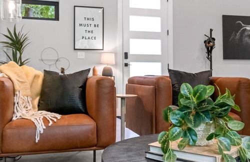 The beautifully decorated two-story home in Rogers is the ideal getaway for larger groups of friends and family seeking a relaxing escape in a secluded yet conveniently located modern cabin.