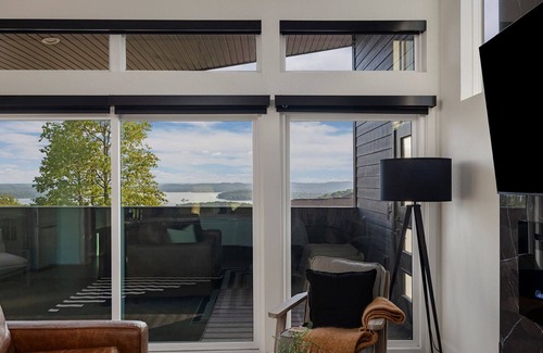 Expansive floor-to-ceiling windows seamlessly blend Table Rock Lake's beauty with the airy interior. Whether you're unwinding by the fire or indulging in your favorite shows on the 55" 4K TV with cable and full streaming options, opulence envelops you. Replenish your energy in the lavish king-sized bed, and at night, effortlessly lower the blinds with the touch of a remote. The cottage is equipped with dinning essentials, including a fridge, microwave, coffee maker and dishwasher, but is not equipped with a stove or oven. Refresh in the spa-inspired bathroom featuring a deep soaker tub for two. Step onto your private, furnished balcony, relishing the invigorating mountain breeze as you gaze upon the limitless horizon where Table Rock Lake harmoniously meets the sky.
