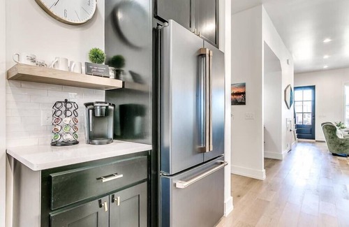 Inside, the open floor plan joins the kitchen, dining area and living room, so your group can gather all together. A gorgeous living room bar with cooled beverage drawers and a built in fire place are unique features that make this living area stand out. The state of the art kitchen is fully stocked with dishes and cookware and the custom dining table comfortably seats 10 people. A record player enhances the ambiance in this entertainer's dream space!