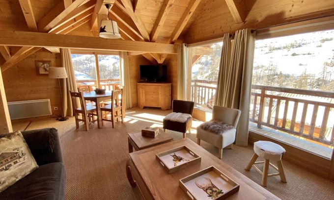 Luxury chalet 160 m2 for 10 people, shuttle bus at 50m, 3mn from the lifts is located in Vars. Luxury chalet 160 m2 for 10 people, shuttle bus at 50m, 3mn from the lifts provides accommodation, featuring Kitchen, Laundry, TV, among other amenities. This Ski Chalet features Kitchen, Laundry, TV, to make your stay a comfortable one.