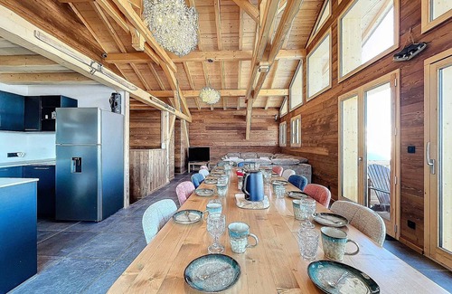 The living area consists of a lounge area with a large double corner sofa and a flat-screen TV, a dining area with a large table that can seat up to 14 guests, all opening onto a fully equipped kitchen featuring a range cooker with induction hobs, a refrigerator with a freezer compartment, a dishwasher, a Nespresso® and filter coffee maker, a microwave, a kettle, a toaster, two raclette grills, and two fondue sets.