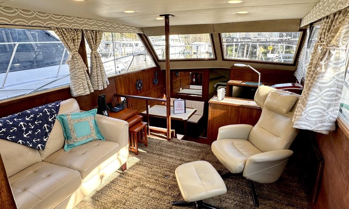 In addition to all the inside living spaces, this classic Chris Craft also features a large aft deck, perfect for lounging around and looking over the marina with a 5-o-clock cocktail in hand. Come nightfall, go on up to the fly-deck and cockpit, and gaze at the stars through the eyes of a captain at the wheel. There is a sound system both inside and outside, so feel free to put your relaxing playlist on and kick back and relax!