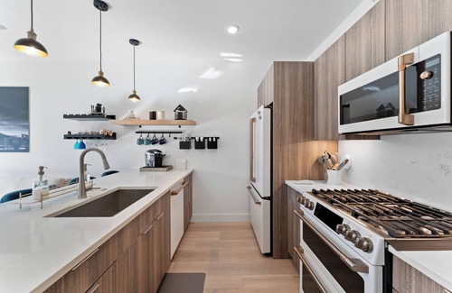 Step into the heart of the condo, where the full kitchen showcases quartz countertops and high-end appliances, including a dual oven, six-burner stovetop, and dishwasher. The breakfast bar with seating for four accommodates casual meals and entertaining. The living room features a queen sleeper sofa, a flat-screen TV with owner-provided streaming services, and remote control blinds to easily adjust the ambiance of the room. The owner has provided a Dyson purifier that is an all-in-one fan, purifier, and humidifier for optimal comfort during your stay. Cozy up by the gas fireplace or step out onto your private balcony for a breath of fresh air.
